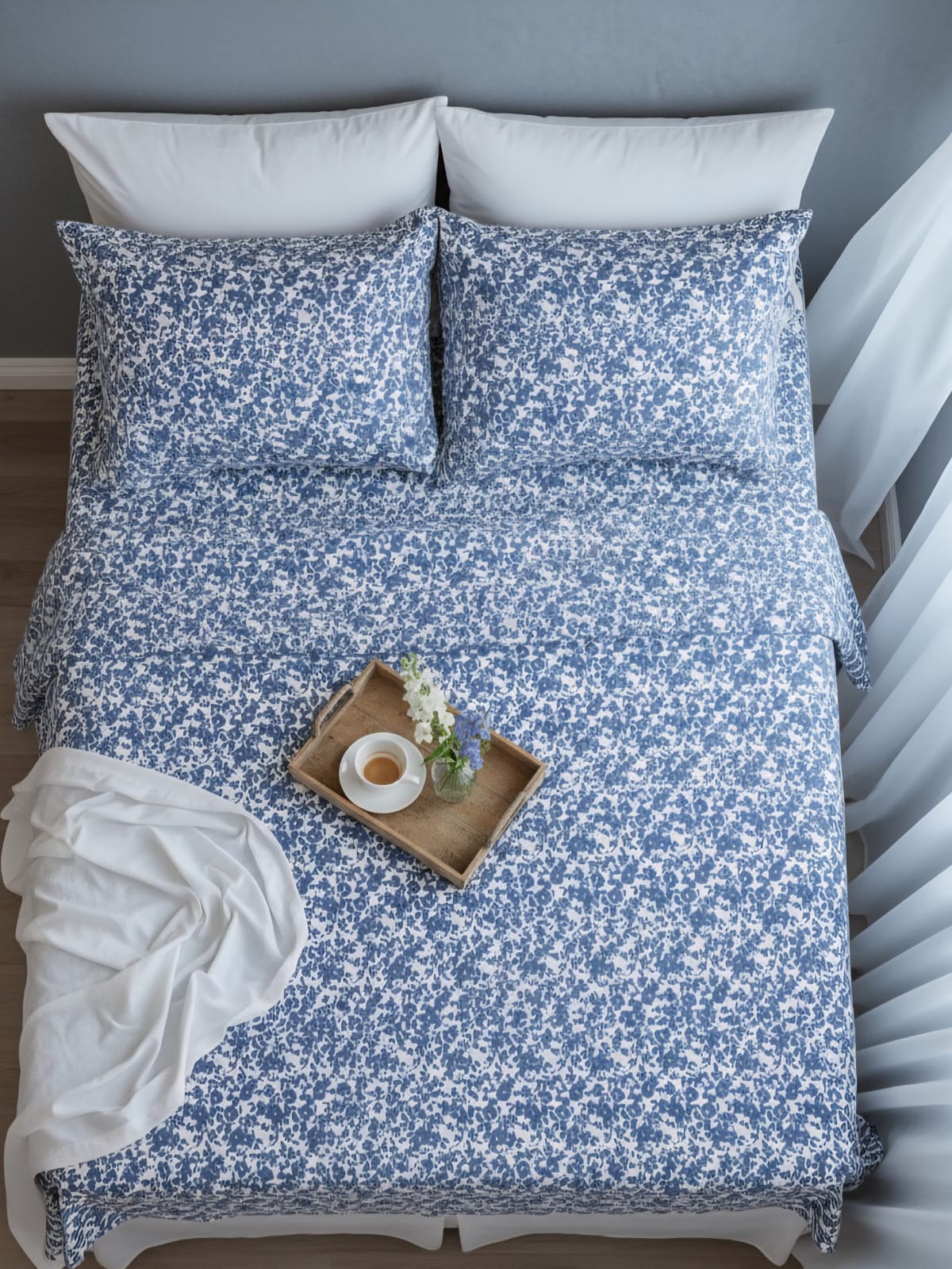 Bring the serenity of a beautiful cottage garden into your bedroom with our Heirloom Blue Floral Bedsheet Set. This beautiful bedding features a delicate, all-over pattern of small, classic powder blue flowers set against a crisp white background, offering a look that is both timeless and fresh.