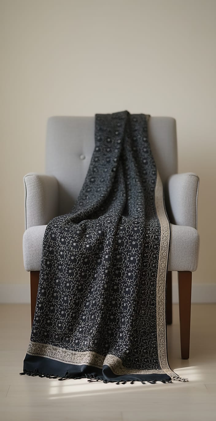 This shawl is an elegant winter wrap crafted from a high-quality wool blend that offers superior warmth and softness.