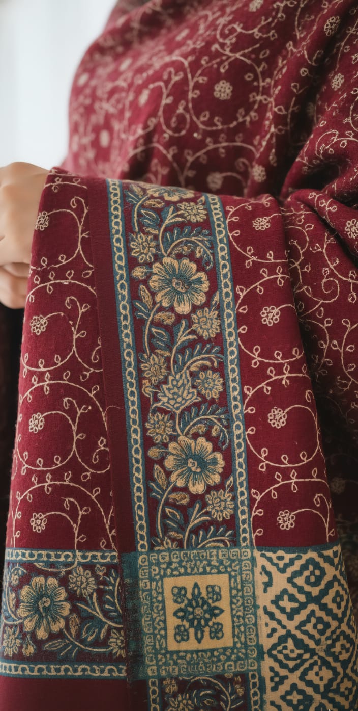 Embrace sophisticated warmth with our exquisite Crimson Bloom Embroidered Shawl. This captivating wrap features a luxurious deep maroon base, richly adorned with delicate off-white floral and vine embroidery. Perfect for adding a touch of opulent color and intricate detail to any ensemble, from elegant evening wear to stylish daytime attire.